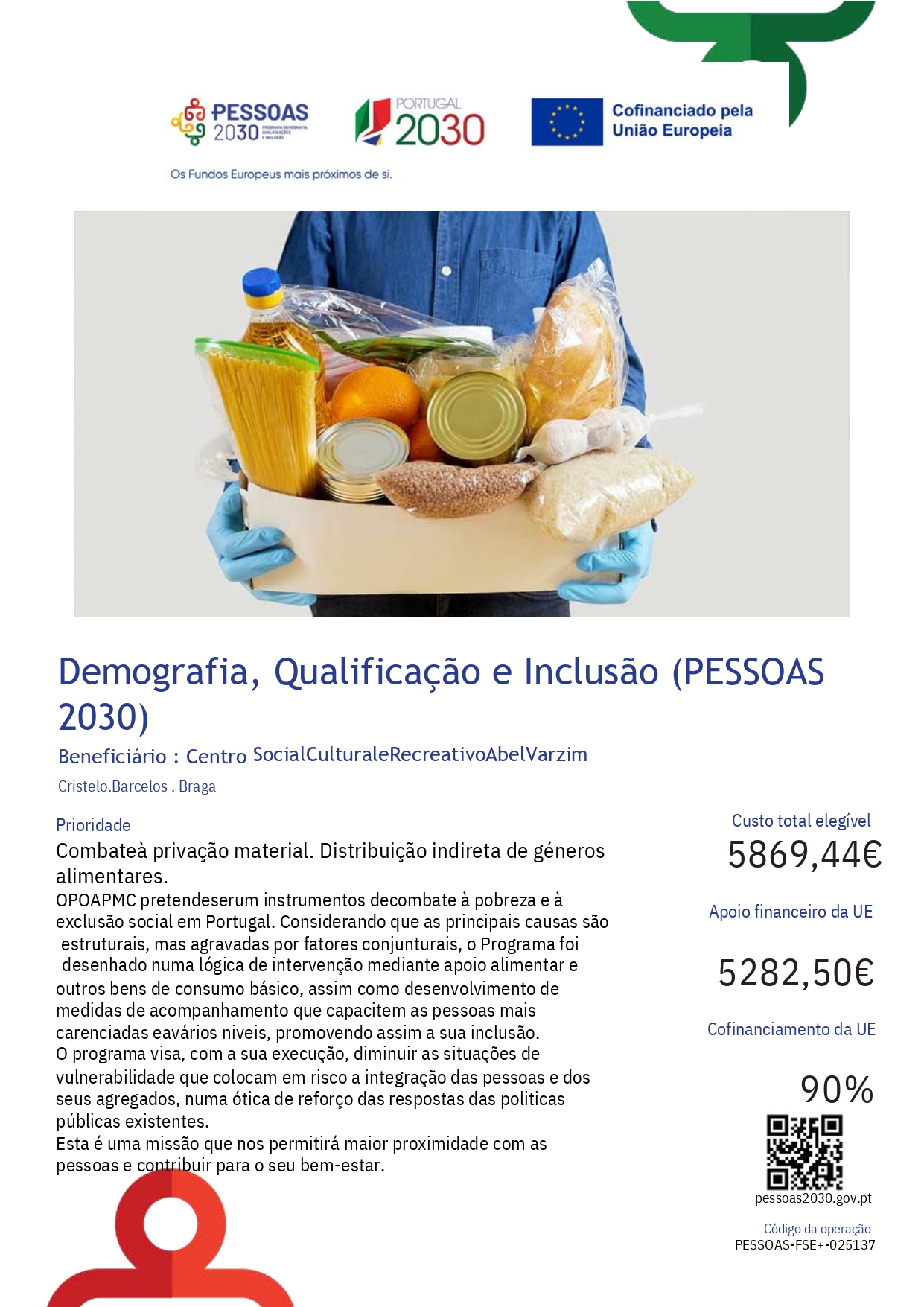 O Centro Social Cultural e Recreativo Abel Varzim sendo entidade mediadora disponibiliza uma técnica de Serviço Social, que está responsável pela gestão da distribuição dos produtos aos 64 beneficiários.